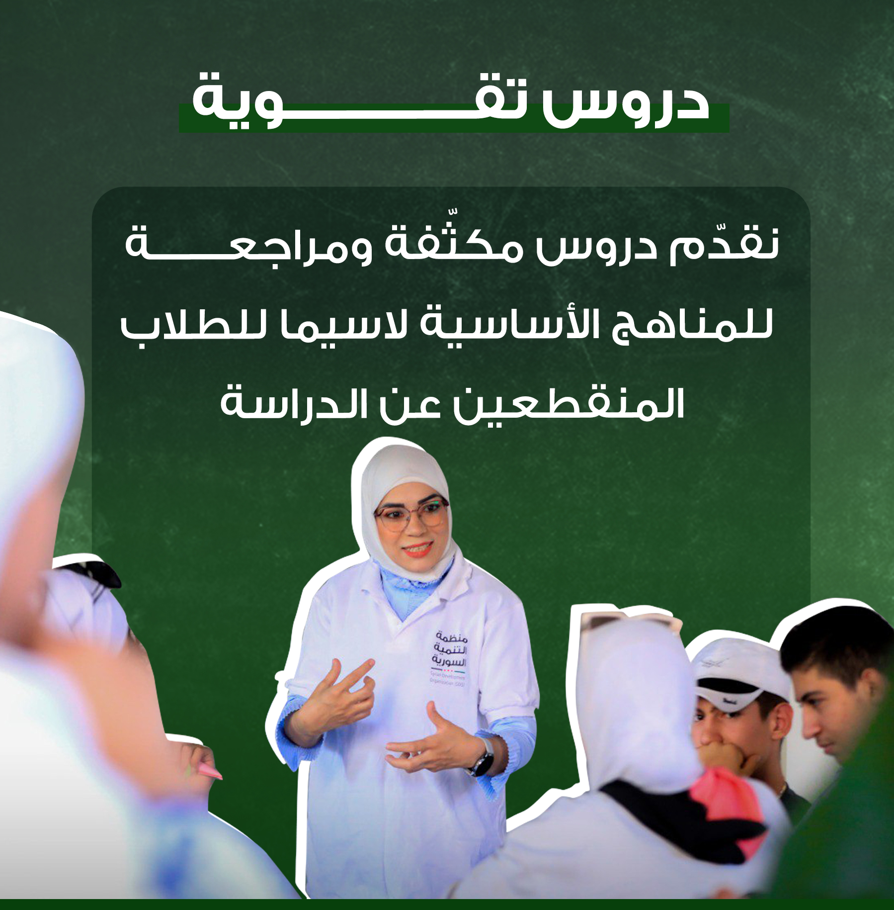 نفي إطار جهودها المستمرة لدعم العملية التعليمية وتعزيز فرص التعلّم لدى الأطفال واليافعين، أنجزت منظمة التنمية السورية خلال العام الدراسي الماضي أكثر من 9500 نشاط تعليمي ضمن مناراتها المجتمعية،