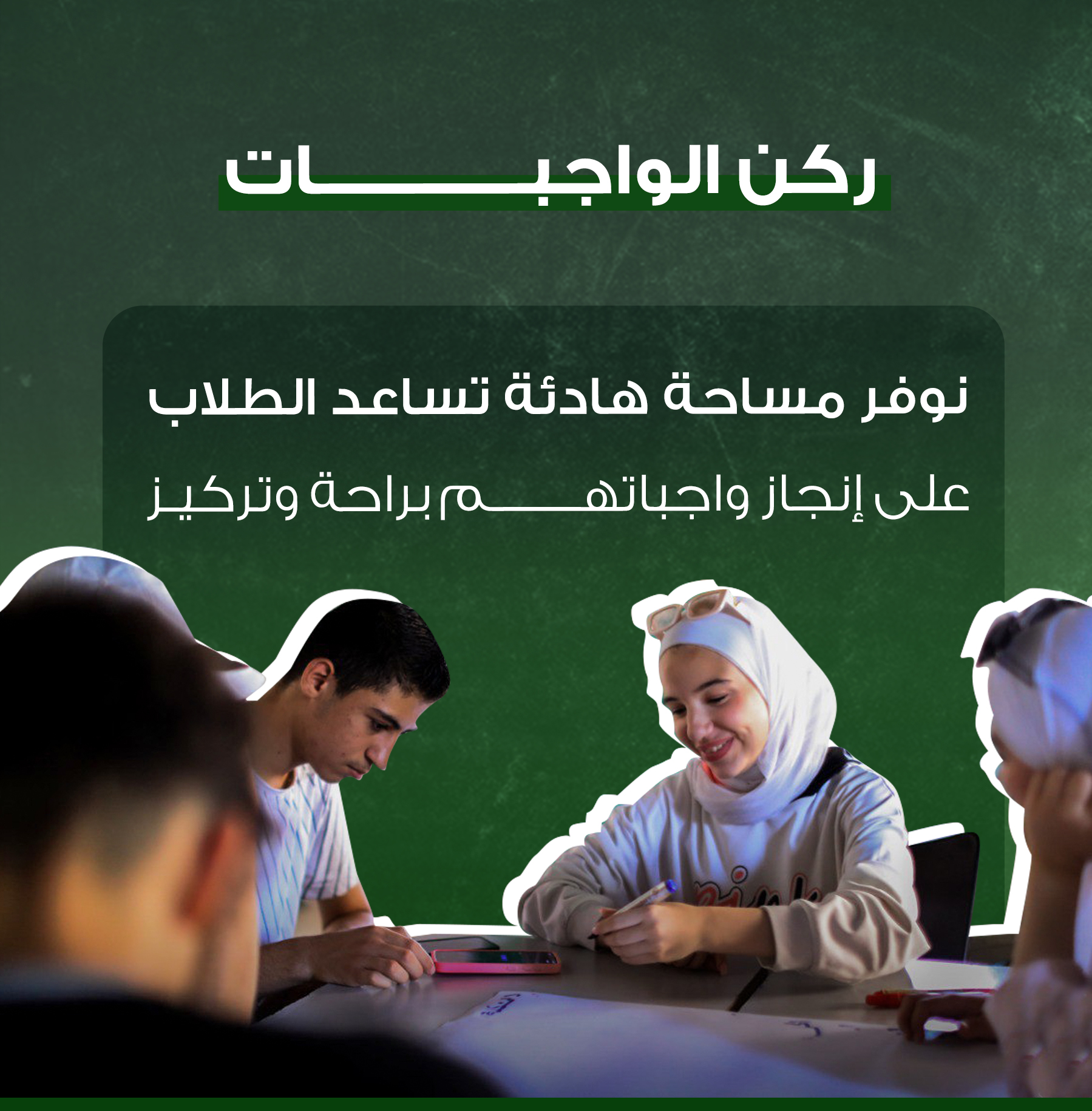 ركن حلّ الوظائف الذي يوفّر مساحة داعمة لمساعدة الطلاب على إنجاز واجباتهم المدرسية بإشراف المعلمين.